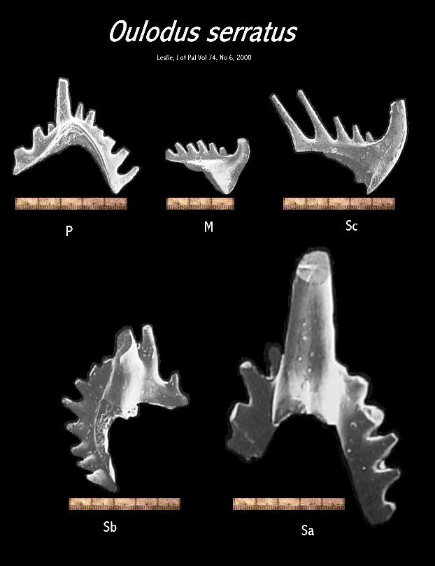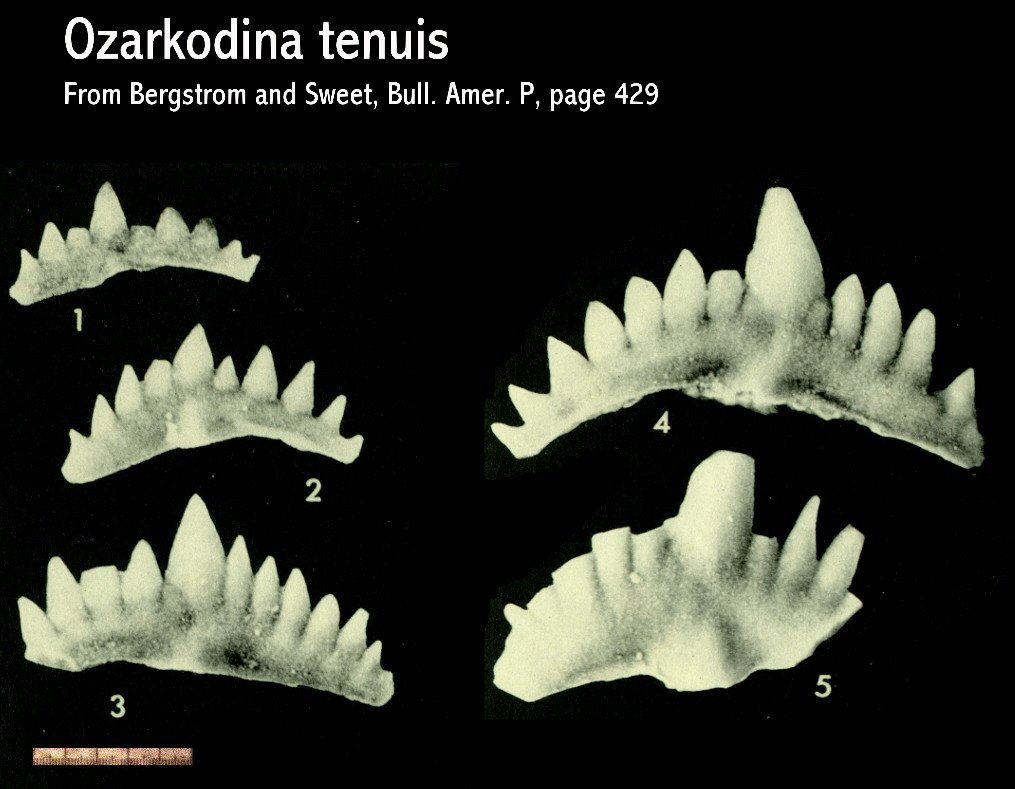 Text Published With Plate -- Lateral views of 5 specimens representing a sequence of growth stages. All from collection 60PJ-32. OSU 27450, 27451, 27452, 27453, 27454 References : Bergstrom and Sweet: Conodonts from the Lexington Limestone (Middle Ordovician) of Kentucky and it's Lateral Equivalents in Ohio and Indiana, Bulletins of American Paleontology, V 50, 1966 pg. 267-442